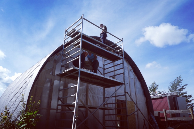 Na Escandinávia, pude sentir a igualdade de gênero trabalhando com duas empoderadas mulheres na construção de suas próprias casas. Como são fortes fisicamente! Foi a experiência que mais me exigiu esforço físico. Enchi e carreguei carrinho de mão completo de areia, serrei madeiras, usei a furadeira, subi no telhado (tudo também pela primeira vez). Nesta foto, por exemplo, estávamos finalizando a construção de um telhado vivo com sedum, musgos e mais algumas pequenas plantas. Compartilhei no blog todo o processo.