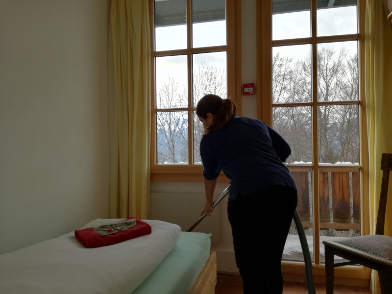 Este foi um serviço no estilo camareira em um centro de unidade situado nos Alpes Suíços. Alternava minhas atividades na cozinha e na manutenção das instalações, onde eu também tinha um confortável quarto como o dos hóspedes pagantes. Recebíamos grupos fechados para seminários de yoga, dança e canto durante o charmoso inverno suíço. Fazíamos todas as refeições juntos (voluntários, integrantes da comunidade e seminaristas) e trocávamos preciosas experiências.