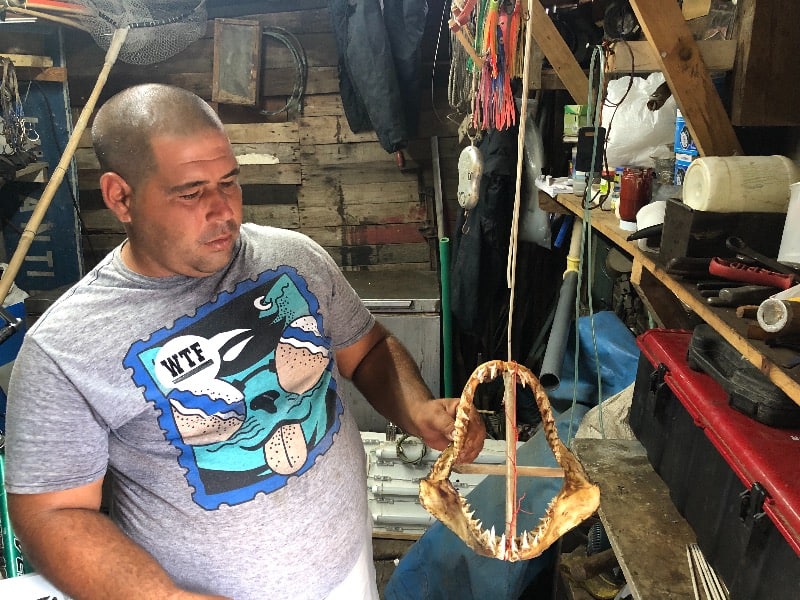 Na casa tem todo o material que ele utiliza, além de um freezer velho e seus troféus de pescaria. Foi me dizendo pra que servia cada coisa até que avistei uma boca enorme cheia de dentes em formato de triângulo, bem pequenos, e uma cruz de madeira que fazia com que essa mandíbula permanecesse aberta. Logo, pedi para me falar sobre aquilo. Fernando com seu jeito simples e uma certa timidez, transformou-se no rei do mar. Pegou a mandíbula, saiu da casinha, direcionou-se aonde os outros estavam. Fiquei um pouco confusa com a mudança de atitude, mas foi logo mostrando o que estava em sua mão a um companheiro que parecia ser sua testemunha.